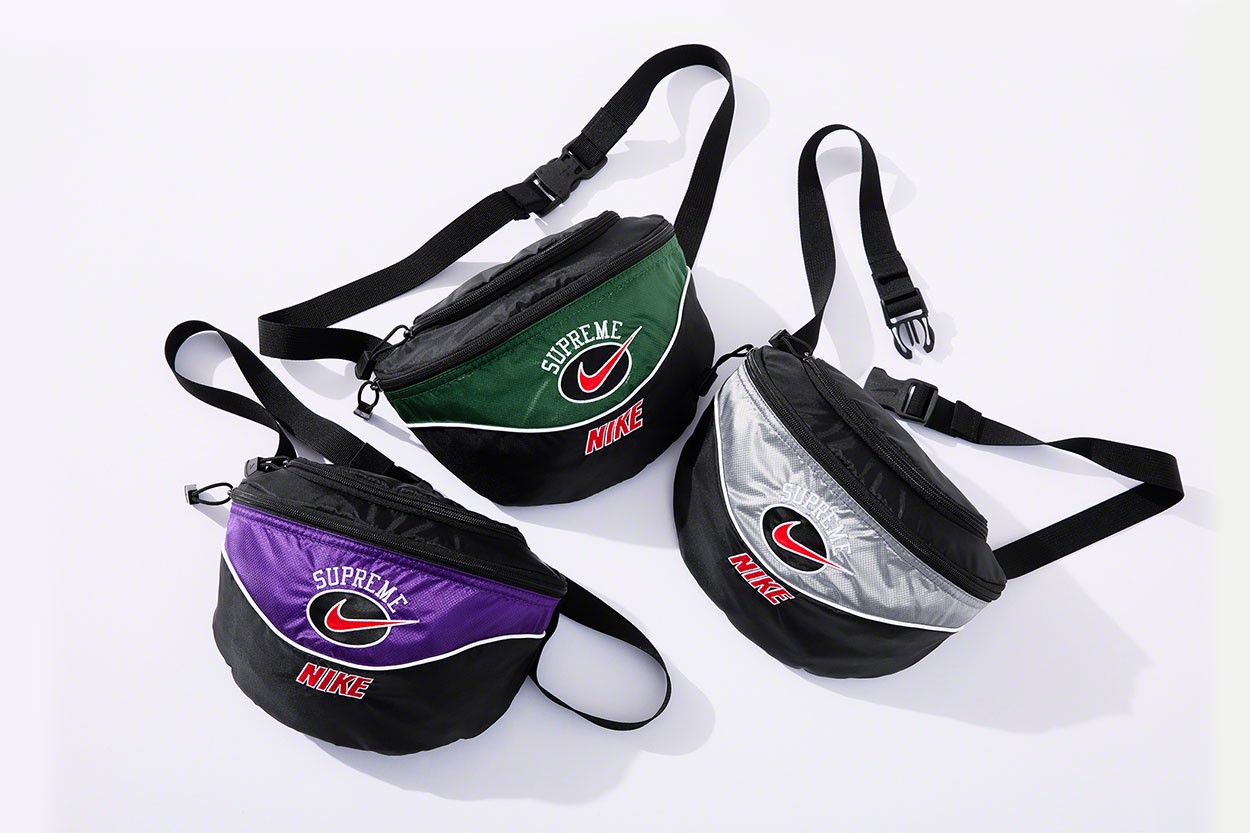 컬렉션 포인트 : 두 브랜드의 협업을 살펴보면 레트로의 느낌이 물씬 풍기는 비주얼을 선보였다. 1990년대 영감을 받아 선보였으며 나이키 로고와 슈프림 레터링 로고를 중심으로 스포츠 자켓, 팬츠, 후드, 스우시 스웨터 등 구성됐다. 특히 레드 색상을 포인트로 나이키 로고를 채색했다.