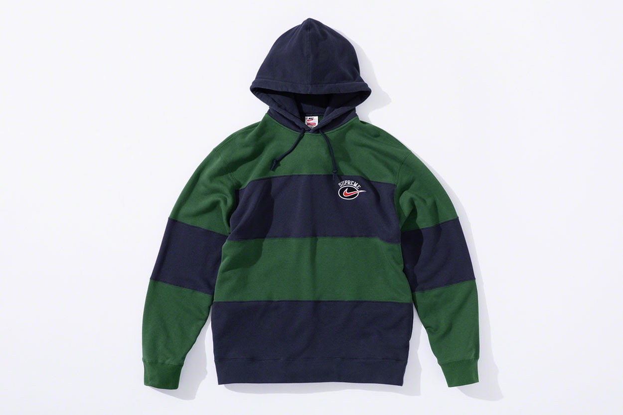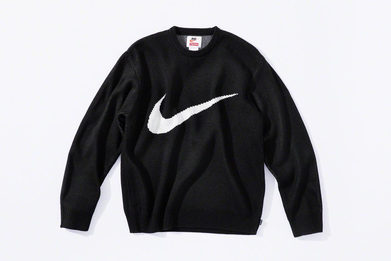컬렉션 포인트 : 두 브랜드의 협업을 살펴보면 레트로의 느낌이 물씬 풍기는 비주얼을 선보였다. 1990년대 영감을 받아 선보였으며 나이키 로고와 슈프림 레터링 로고를 중심으로 스포츠 자켓, 팬츠, 후드, 스우시 스웨터 등 구성됐다. 특히 레드 색상을 포인트로 나이키 로고를 채색했다.