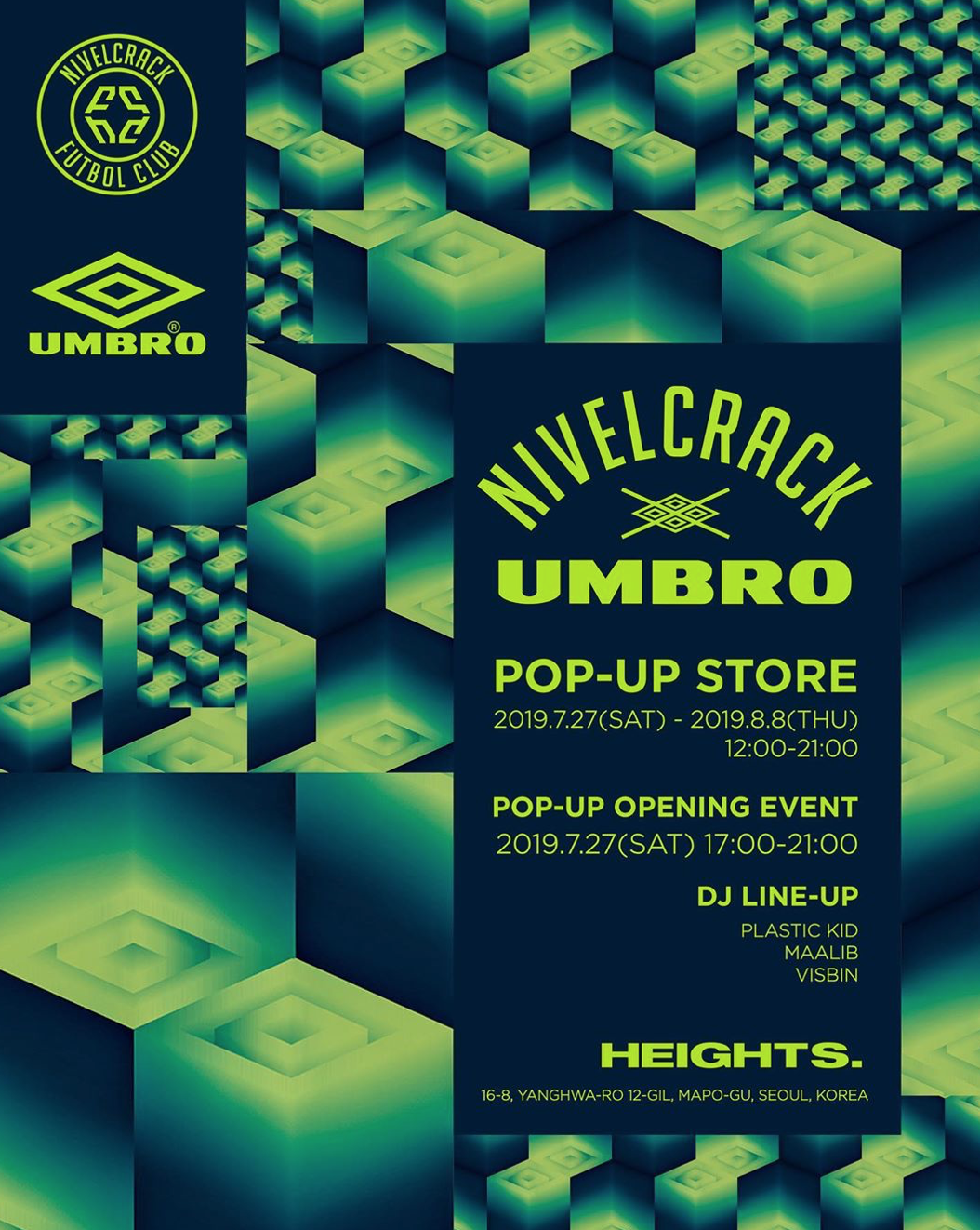 이번 협업을 위해 하이츠 스토어에 팝업 행사가 진행된다. 7월 27일부터 2주동안 진행되며 7월 27일 시원한 맥주와 DJ 말립, DJ 플라스틱 키드 등 신나는 음악을 들을 수 있으며 당일 제품을 구매하면 프리미어 리그와 프리메라리가 공식 파트너인 에이버리 데니슨(Avery Dennison)에서 제작된 니벨크랙 골드 와펜을 증정한다고 하니 많은 구매 바란다.