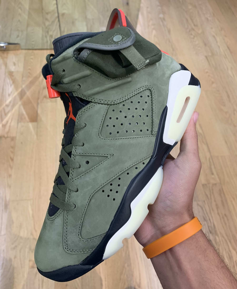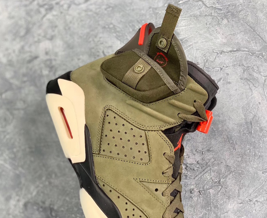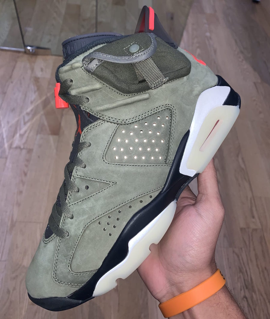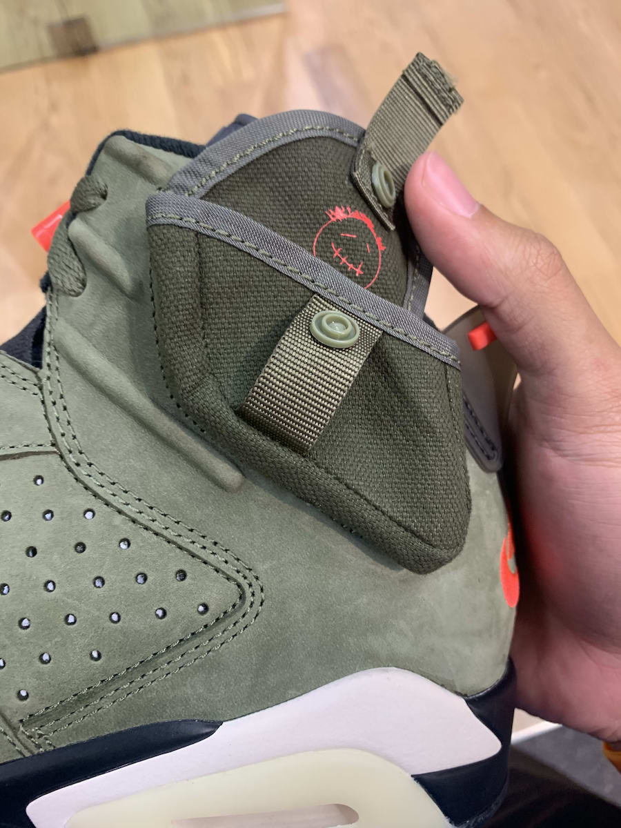 내용 : 트레비스 스캇(Travis Scott)과 나이키(NIKE) 협업 제품이 발매한다. NIKE Air Jordan 6을 기반으로 색상은 카키로 구성됐다. 신발 좌측엔 조그만한 주머니가 부착되어 있다. 힙합 아티스트 답게 총알을 넣고 다니는 용도라고 한다. 우리는 라이터를 넣도록 해보자.