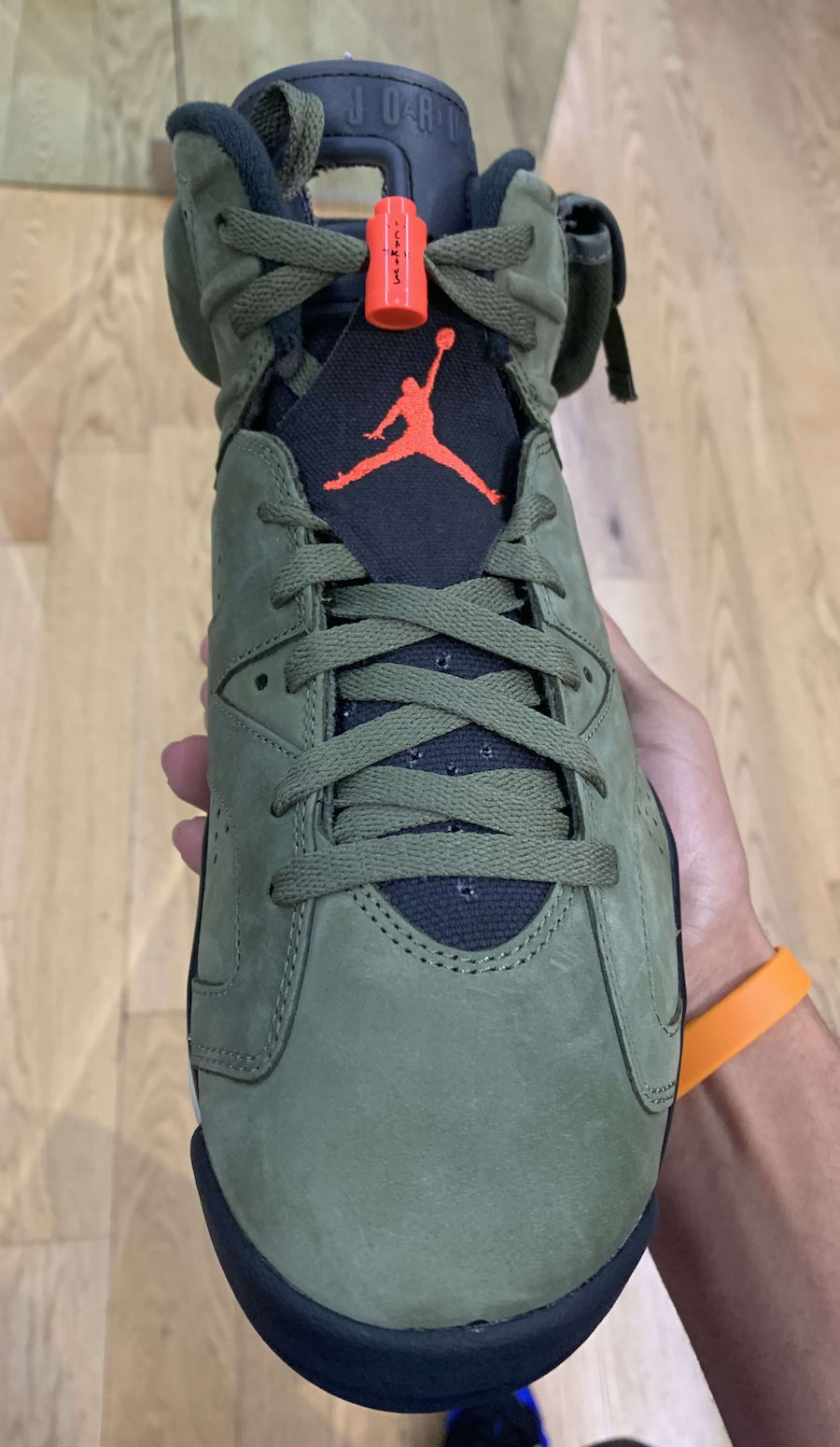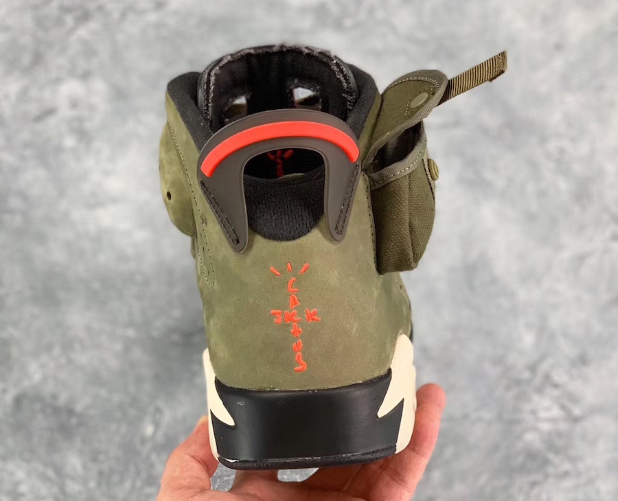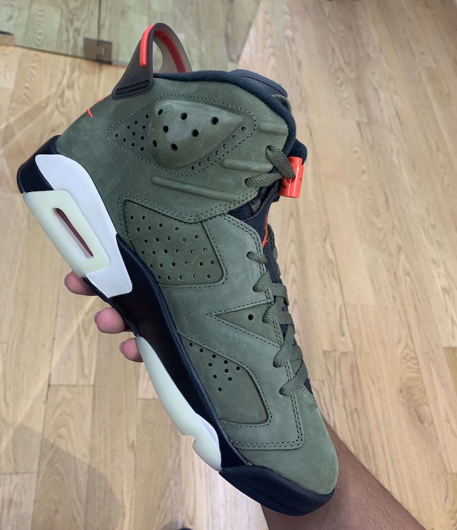 내용 : 트레비스 스캇(Travis Scott)과 나이키(NIKE) 협업 제품이 발매한다. NIKE Air Jordan 6을 기반으로 색상은 카키로 구성됐다. 신발 좌측엔 조그만한 주머니가 부착되어 있다. 힙합 아티스트 답게 총알을 넣고 다니는 용도라고 한다. 우리는 라이터를 넣도록 해보자.