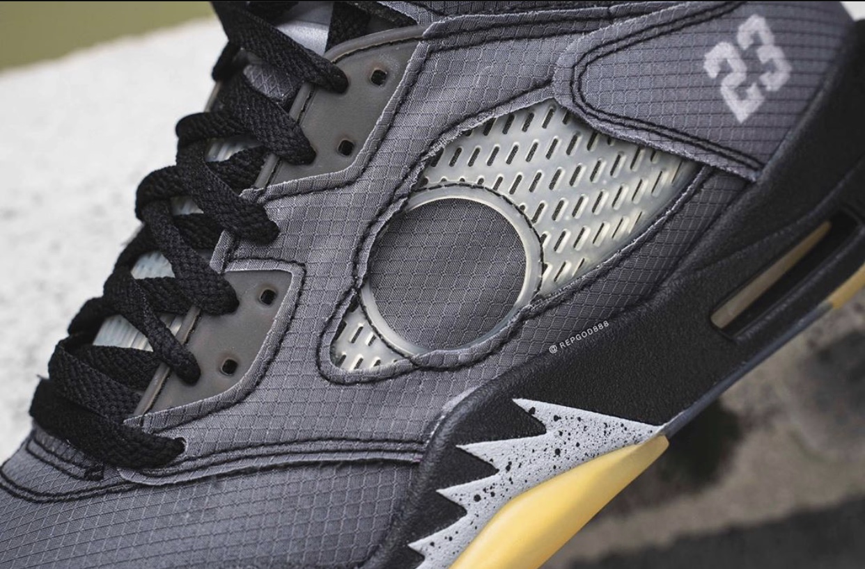 내용 : 오프 화이트(Off White)와 나이키 에어 조던 5(NIKE Air Jordan 5)가 협업을 진행한다. 오프화이트는 나이키 에어 조던1은 협업 한적이 있으나 나이키 에어 조던5는 처음이다. 발매는 2020년 2월에 진행되며 약 260,000원(220달러)로 구성됐다.