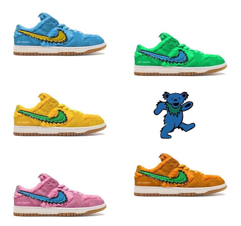 제품은 나이키 SB 덩크 로우(NIKE SB DUNK LOW), 색상은 블루, 그린, 옐로우, 오렌지, 핑크로 총 다 섯가지를 선보일 예정이며 댄싱 베어를 연상케 하듯 수북한 털이 인상적인 디자인입니다. 그레이트풀 데드와 나이키 SB 협업 발매는 10월에 진행된다고 하니 참고 바라겠습니다.